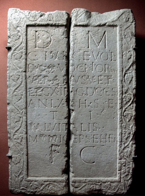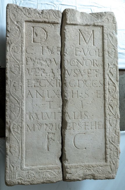 - D(is) M(anibus) / C(aius) Iul(ius) C(ai) <f=E>(ilius) Vol(tinia) / Luco Vocontiorum / Veranus vet(eranus) / leg(ionis) XII[I]I G(eminae) d(ecurio) c(oloniae) C(laudias) S(avariae) / an(norum) LX h(ic) s(itus) e(st) / t(estamento) [f(ieri)] i(ussit) / Val(erius) Vitalis / municeps et her(es) / f(aciendum) c(uravit)