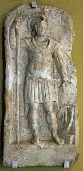 - Mythische Figur: stehender Mars in Helm und Panzer, in der Rechten Lanze, linke Hand auf dem Schild.