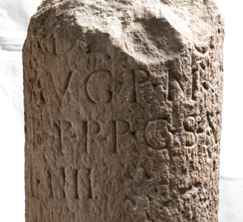 - [Imp(eratori) Caes(ari)] / [M(arco) Antonio] / [Go]rdia[n]o / P(io) F(elici) Aug(usto) p(ontifici) m(aximo) / tr(i)b(unicia) p(otestate) p(atri) p(atriae) c(ivitas) S(ueborum) N(icrensium) / l(eugas) IIII