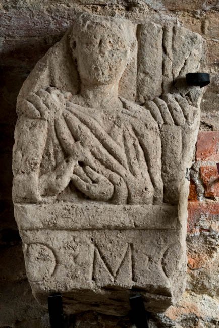 - Familie: Reste der Brustbilder von zwei Kindern und zwei Erwachsenen. Knabe mit Ärmeltunica und Sagum, in den Händen ?. Auf der rechten Schulter Hand. Rechts anschließend Schulter eines Kindes mit Hand eines dahinter stehenden Erwachsenen.