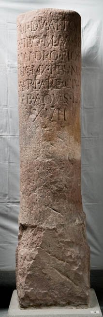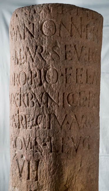 - Imp(eratori) [Cae]s(ari) divi Severi Pii / nepot(i) divi Antonini Pii / Mag(ni) filio M(arco) Aur(elio) Severo / Alexandro Pio Fel(ici) Aug(usto) / pontifici max(imo) tribunici(a)e potes(tatis) / co(n)s(uli) patri patri(a)e civ(itas) Aur(elia) Aq(uensis) / ab Aquis leug(as) / XVII