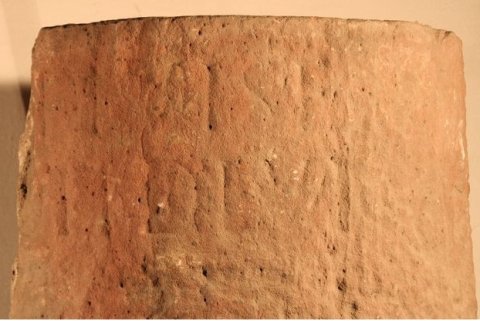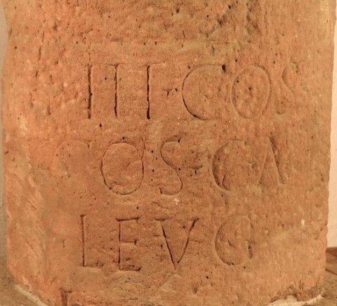 - [Imp(eratori) Caes(ari)] divi Se/[veri nep]oti divi / [[[Antonini Mag(ni) fil(io)]]] / [[[M(arco) Aur(elio) Antonino Pio]]] / [[[Felici Aug(usto) pont(ifici) max(imo)]]] / [trib(unicia) potest(ate)] III co(n)s(uli) / [III p(atri) p(atriae) pro]co(n)s(uli) c(ivitas) A(urelia) / [Aq(uensis) ab Aq(uis)] l(eugas) / [------]