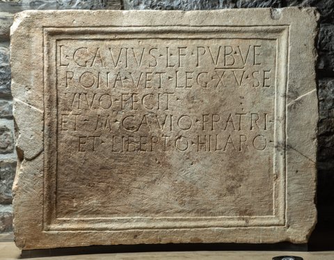 - L(ucius) Gavius L(uci) f(ilius) Pub(lilia) Ve/rona vet(eranus) leg(ionis) XV se / vivo fecit / et M(arco) Gavio fratri / et liberto Hilaro