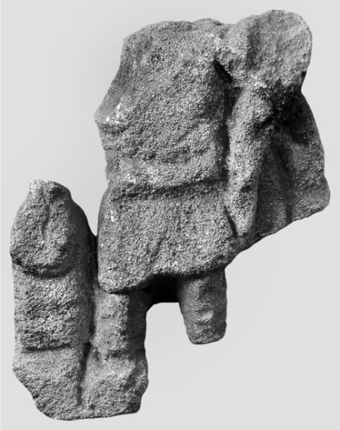 - Aus zwei Teilen zusammengesetzt. Kopf, rechter Arm, linker Unterschenkel mit Fuß, Mantelzipfel und oberer Teil des Füllhorns abgebrochen. Stark verwittert.
