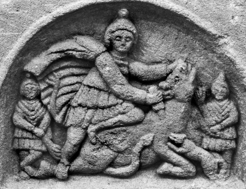 - Mythos (Mithras): Stiertötung (Tauroktonie) mit Cautes und Cautopates, Schlange und Hund.