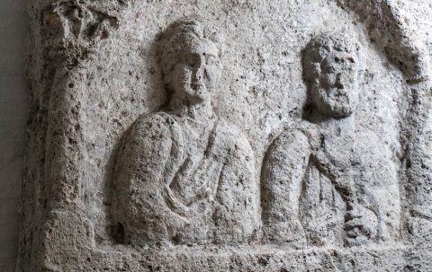 Im Hauptbild unter Doppelbogen auf Säulen zwei Halbfiguren (Ehepaar). Links Frau: gewelltes Haar, Tunica, Mantel. Rechts Mann: bärtig, Locken, Ärmeltunica, Sagum, Rolle (volumen).