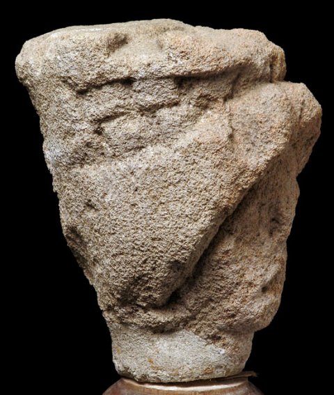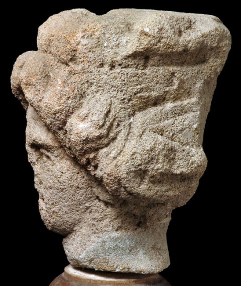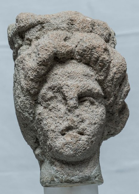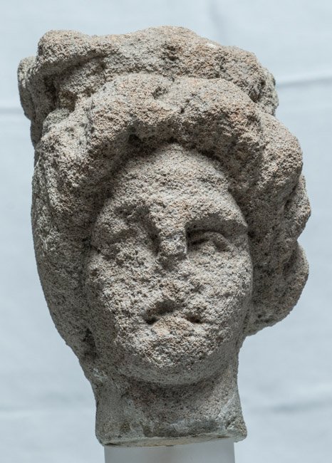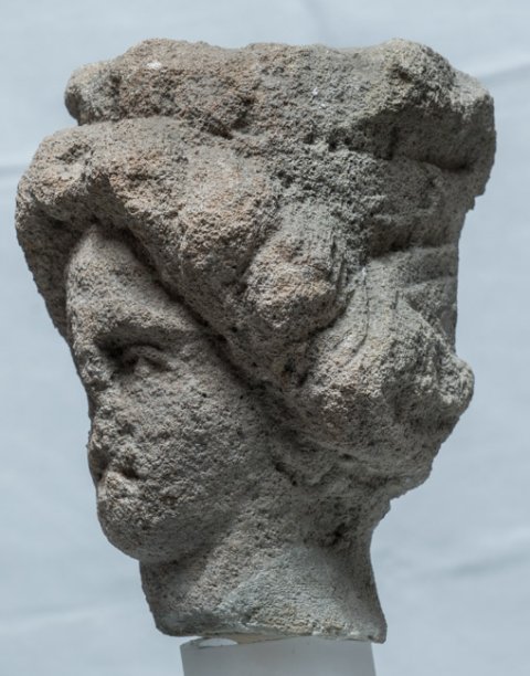 - Mythische Figur: jugendlicher Kopf mit gelocktem aufgesteckten (?) Haar und großer Mauerkrone (?). Genius oder Tyche ?