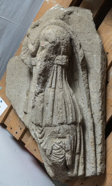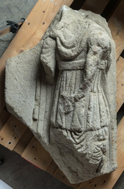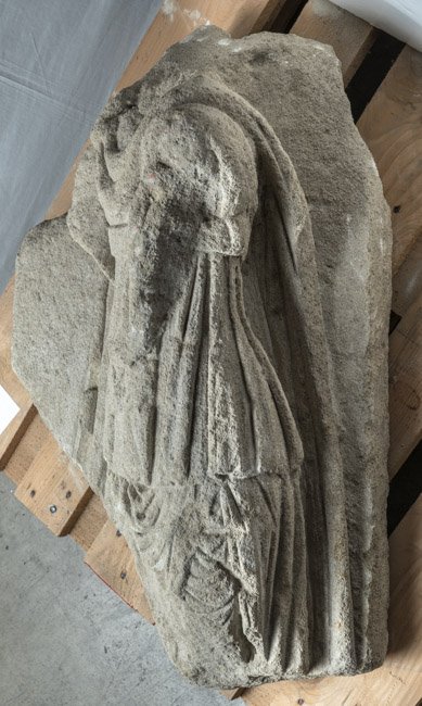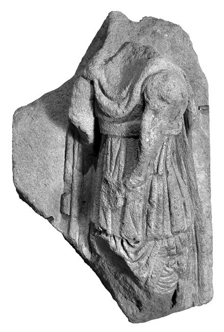 - Die den Hintergrund bildende Platte oben u. unten abgeb., ebenso der Kopf sowie großteils Arme u. Beine der Figur. Oberfläche stark verwittert u. abgerieben.