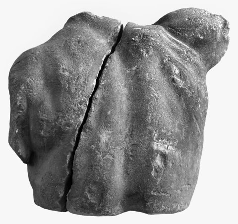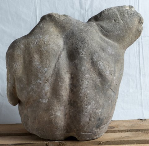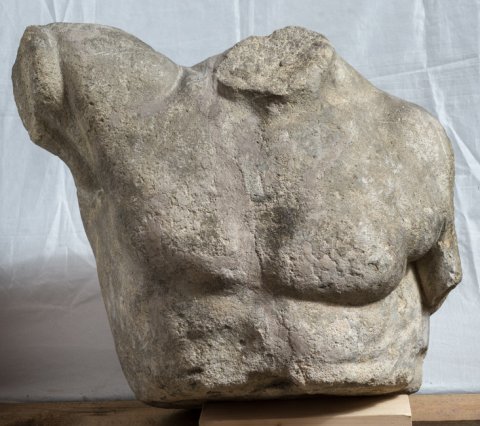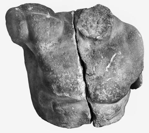 - Mythische Figur (?): nackter Oberkörper einer überlebensgroßen Sitzstatue. Gott ? Athlet ? heroisierter Kaiser ?