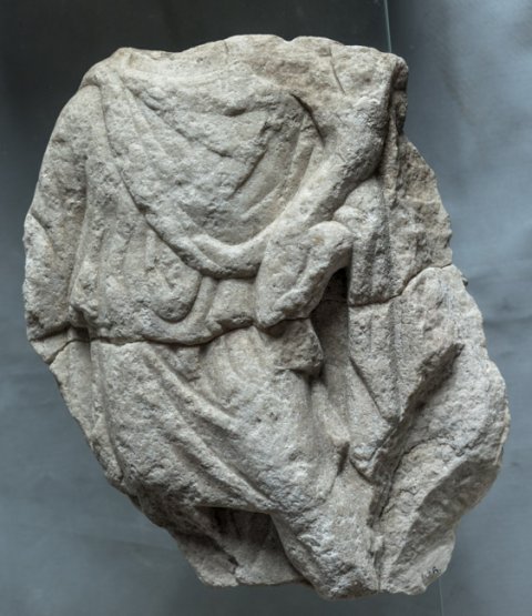- Mythische Figur: Silvanus in kurzer Tunica und Mantel mit Scheibenfibel, phrygische Mütze (?), im linken Arm Zweig.