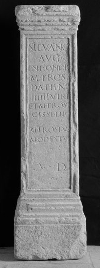 - Silvano / Aug(usto) / in honor(em) / M(arci) Trosi / Daphni / IIIIIIviri / et M(arci) Trosi / Cissi lib(erti) / M(arcus) Trosius / Modestus / d(onum) d(edit)