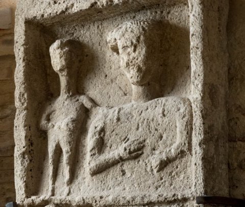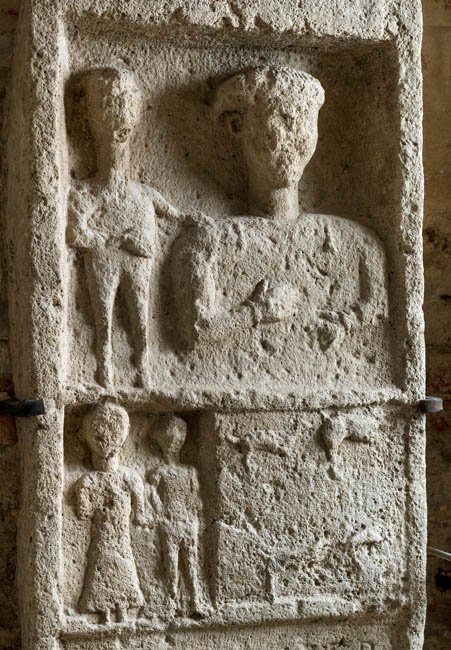 Im Hauptbild Familie (Mädchen und Kind ?): in Rechtecknische Halbfigur eines einheimischen Mädchens:Haarkranz, Fibeln, Halsreif, Armbänder. Links kleine stehende Ganzfigur (Knabe ?).