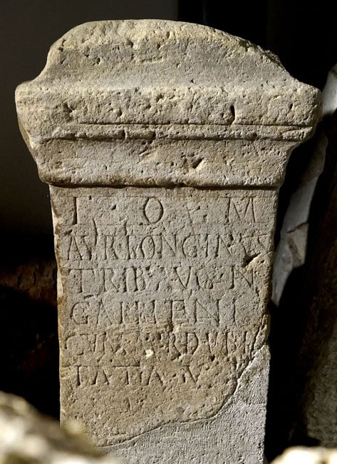 - I(ovi) o(ptimo) m(aximo) / Aur(elius) Longinus / trib(unus) Aug(usti) n(ostri) / Gallieni / cum Aur(elia) Dubi/tata v(otum) [-]