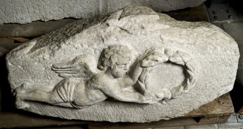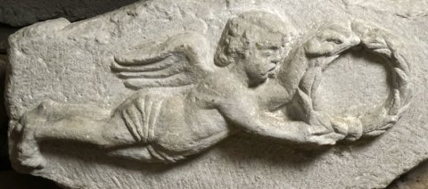 - Mythische Figur: im Giebelfeld des dachförmigen Deckels schwebender geflügelter Knabe (Genius, Erot) mit Lendenschurz, in den Händen Kranz.