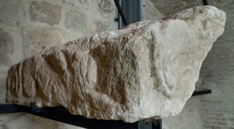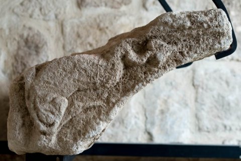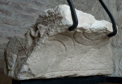 Flaches Dach über Tonnenwölbung. Auf der Stirnseite im Zwickel Delphin, auf der linken Seitenfläche Schwanz eines Meerwesens, Tonnenfläche mit eingeritzten Kreisen und Halbkreisen verziert. - Kommentar