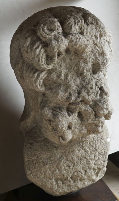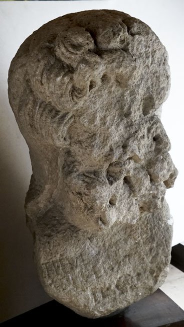- Mythische Figur: Jupiterkopf mit langem gelocktem Haar und Bart. Auf der Büste Inschrift.