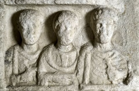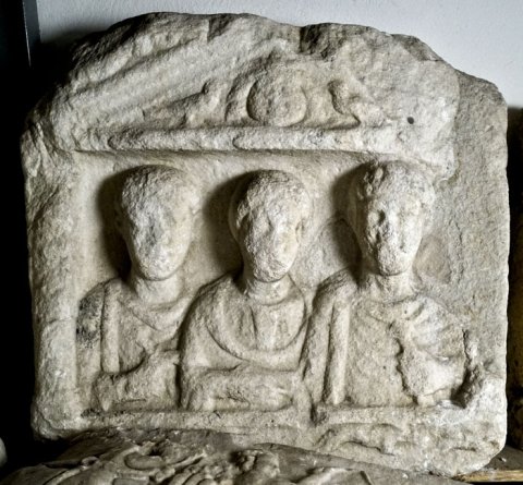 - Eingeschriebener Giebel mit Gorgoneion zwischen Vögeln, auf den Giebelschrägen Meerwesen. Im Hauptbild Halbfiguren einer Familie zwischen Säulen: Frau im Mantel zwischen zwei Männern im Sagum (Soldat), der rechte mit Schwertgriff in der Linken. Zwischenfries mit laufenden Tieren.