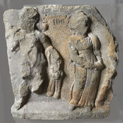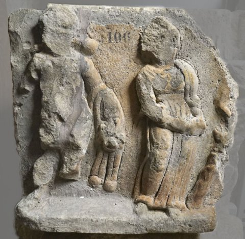 - zerbrochen, rechts abgebr., unten tlw. abgebr., stark bestoßen