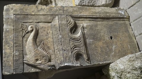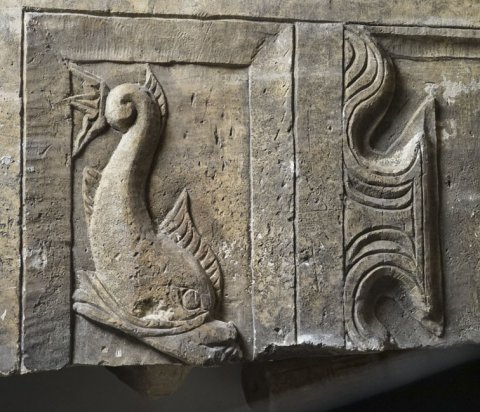 - Leeres Schriftfeld, Rahmen seitlich mit sogen. Barockmotiv. In den Seitenfeldern Delphin.
