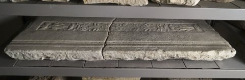 - Platte mit profilierten Rahmenleisten an den Längsseiten. Rechteckiges Mittelfeld (Soffitte) mit Rankenornament (an beiden Enden Blattkelch, aus dem Blütenranken wachsen).