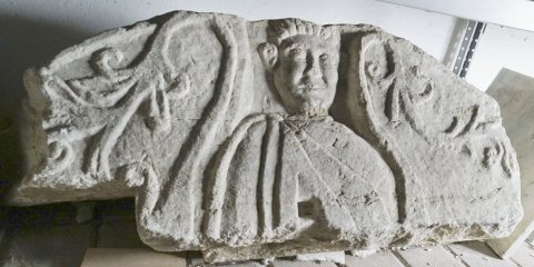- Reliefblock, oben flach bogenförmiger Abschluss. Tympanon eines Aedicula-Daches ? Brustbild eines bartlosen Mannes im Sagum mit Scheibenfibel, flankiert von Ranken.