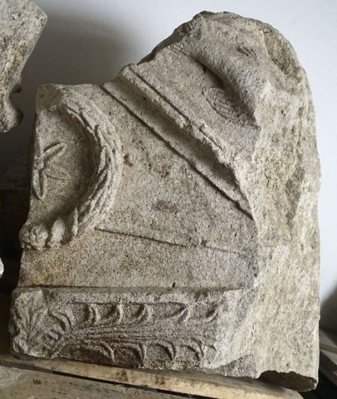 - Eingeschriebener Giebel mit Kranz, darin Rosette, Auf der Giebelschräge Fisch (Meerwesen ?), unter dem Giebelfeld Akanthusornament.