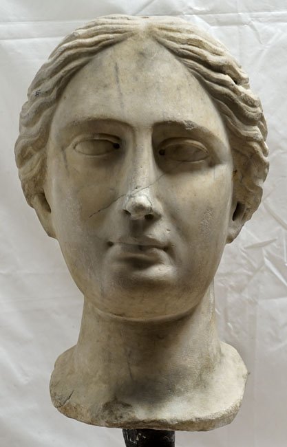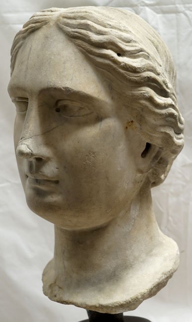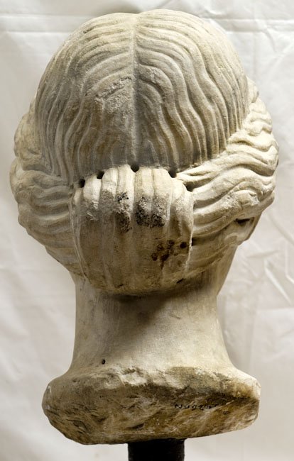 - Mythische Figur : Göttin mit im Nacken aufgestecktem Haar, im Knoten Löcher für Metallverzierungen.