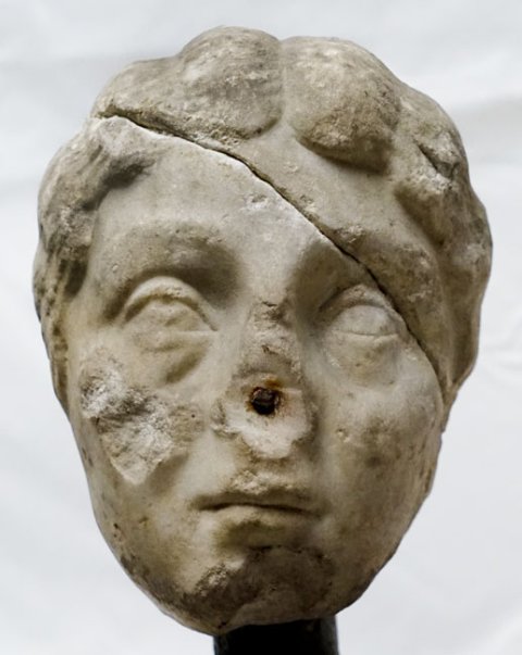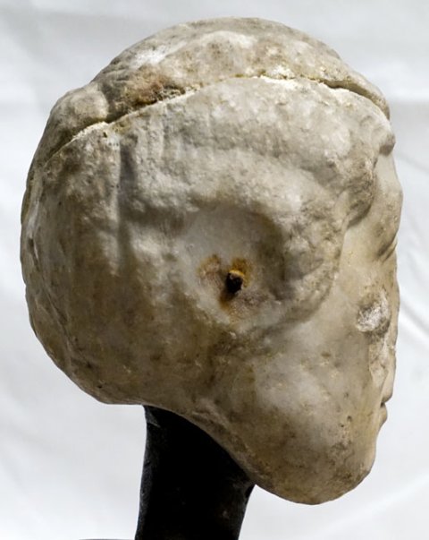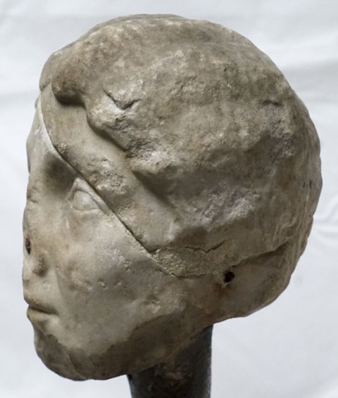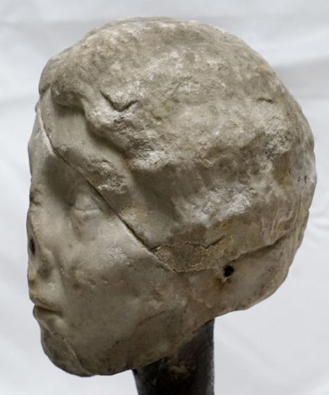 - bestoßen, unter dem Kinn abgebr., Bruchstelle durch Oberkopf u. linkes Auge