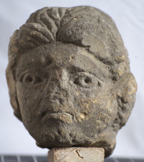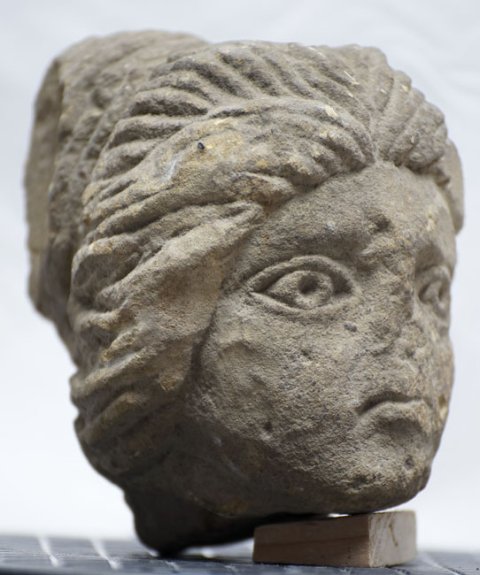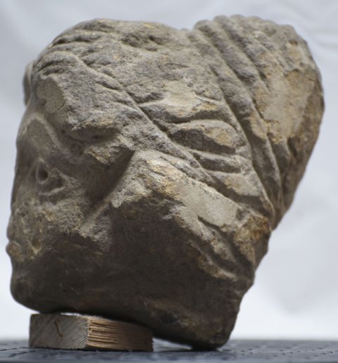 - Kopf einer Frau (Sphinx ?) mit Haarknoten am Hinterkopf