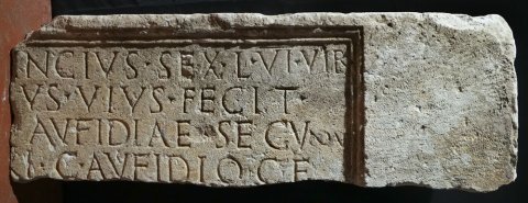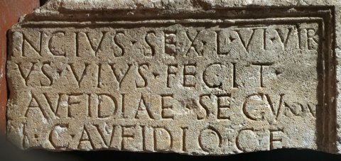 - [---]incius Sex(ti) l(ibertus) VIvir / [---]us vivus fecit / [---] Aufidiae Secund(a)e / [---]+i C(aio) Aufidio C(ai) f(ilio) / [---