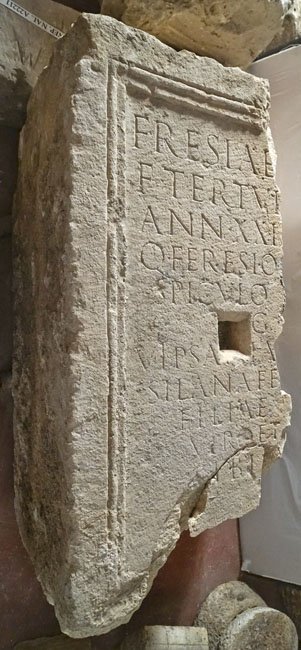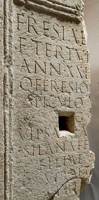 - F(e)resiae Q(uinti) / f(iliae) Tertullae / ann(orum) XXIIII / Q(uinto) Feresio Q(uinti) l(iberto) / Spiculo [Au]g(ustali) / Vipsania M(arci) f(ilia) / Silana fec(it) / filiae / viro et / sibi