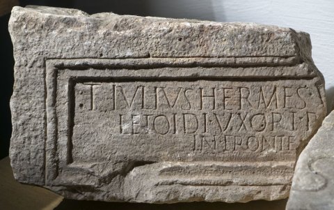 - T(itus) Iulius Hermes [---] / Letoidi uxori p[iissimae?] / in fronte [---]