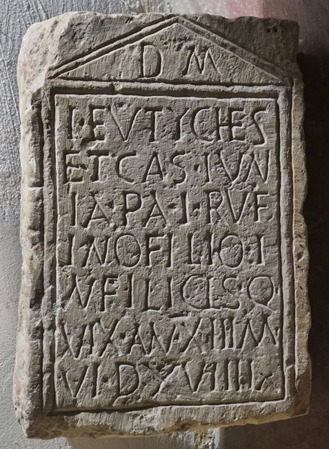 - D(is) M(anibus) // I(ulius) Eutyches / et Cas(sia) Iun/ia pa(rentes) I(ulio) Ruf/ino filio i/nfilicis(simo)(!) q(ui) / vix(it) an(nos) XIII m(enses) / VI d(ies) XVIIII