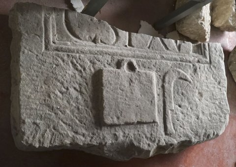 - Sockelbild mit Werkzeug (Harpe und Tasche)