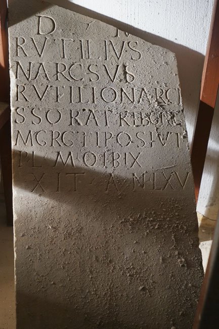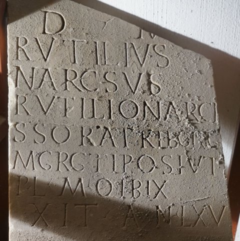 - D(is) M(anibus) / Rutilius / Narc(is)sus / Rutilio Narci/sso ratri(!) bgng(!) / mgrg(n)ti(!) posiut(!) / pl(us) m(inus) q(u)i bix/xit(!) an(nos) LXV
