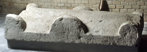 - Dachförmiger Deckel mit unverzierten Eckakroteren und einem Mittelakroter.