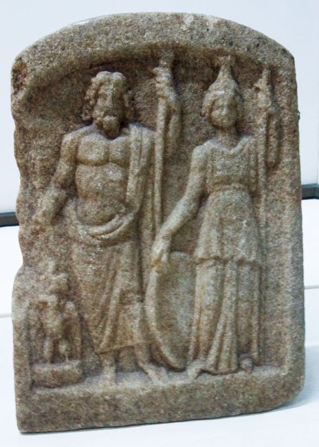 - Mythische Figuren: Jupiter mit Hüftmantel, in der Linken Szepter, neben dem rechten Bein Adler. Minerva mit Helm, Schild und Lanze.
