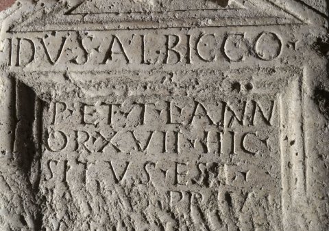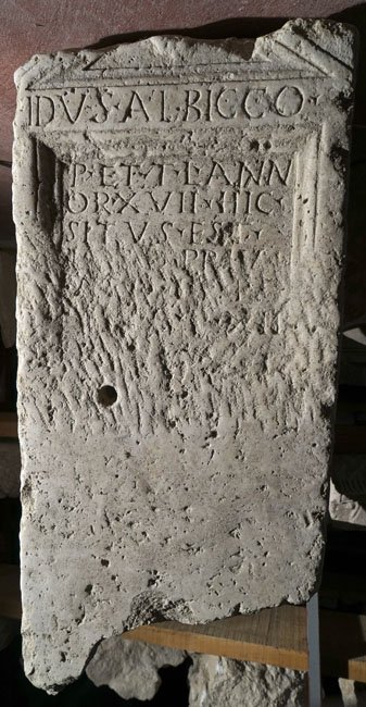 - Fidus Albicco // P(ublii) et T(itii) l(ibertus) ann/or(um) XVII hic / situs est / [[----]]PRIV / [[------]] / [[------]] / [[------]]