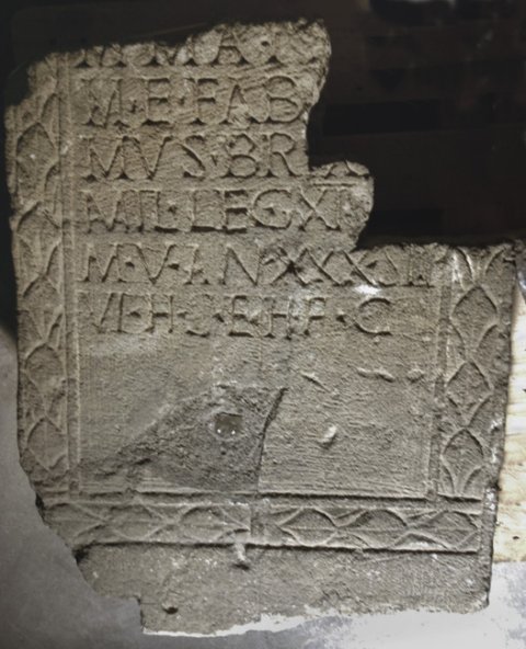 M(arcus) Matius / M(arci) f(ilius) Fab(ia) Maxi/mus Brix[ia] / mil(es) leg(ionis) XII[II] / G(eminae) M(artiae) V(ictricis) an(norum) XXX stip(endiorum) / VI h(ic) s(itus) e(st) h(eres) f(aciendum) c(uravit)