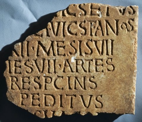 - [D(is)] M(anibus) / [---] Lucius / [---] K(a)rpo / [---]icsetus / [---]ci vics(i)t! an(n)os / [--]XII me(n)sis ! VII / [d]ies VII artes / [--] resp(i)ci(e)ns / [--] peditus / [---]SVM(?)[--] / [---?