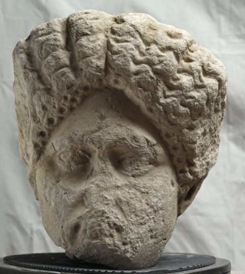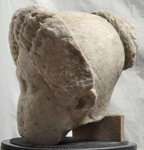 - unter dem Kinn abgebr., Gesicht stark abgewittert, Frisur an beiden Schläfen abgeschlagen