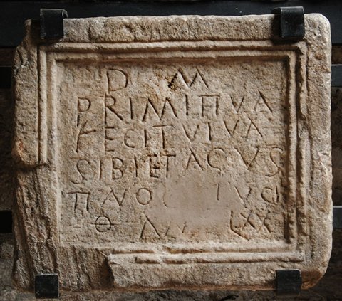 - D(is) M(anibus) / Primitiva / fecit viva / sibi et A(u)gus/tino co(n)iugi / an(norum) LXX
