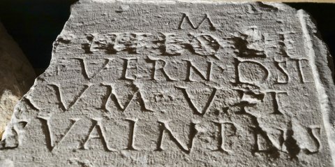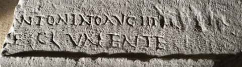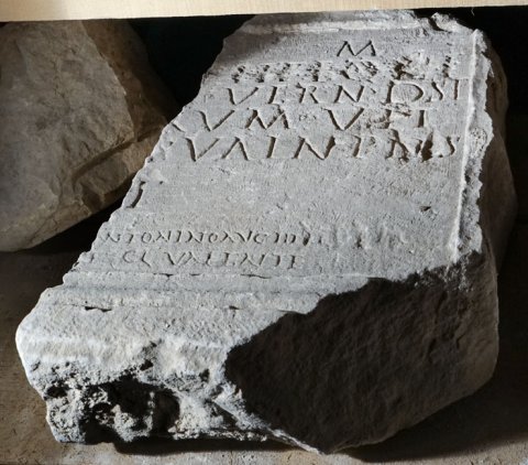 - [D(is)] M(anibus)? / [[---lo C(ai)? f(ilio)]] / [---] vern(ae) DST / [---]rum V[-]T / [---] sua inp(e)ns(a) / [posui]t ? // [Imp(eratore)] Antonino Aug(usto) III / [[et Geta]] / [[Caes(are) II co(n)s(ulibus) curant]]e ? Cl(audio) Valente