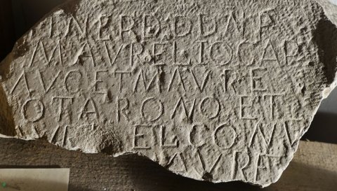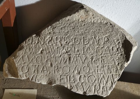 - [---[INER DDD(ominorum?) n(ostrorum?) P() / [---] M(arco) Aurelio Cap/[itolino?] Aug(ustali?) et M(arco) Aure(lio) / [---]otarono et / [---] Aur[el(io)] ELCONV / [---] Aure[lio] / [---?