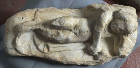 - Mythische Figur: schlafender Amor (Erot, Hypnos ?) mit Mohnkapseln (?) in der rechten Hand.