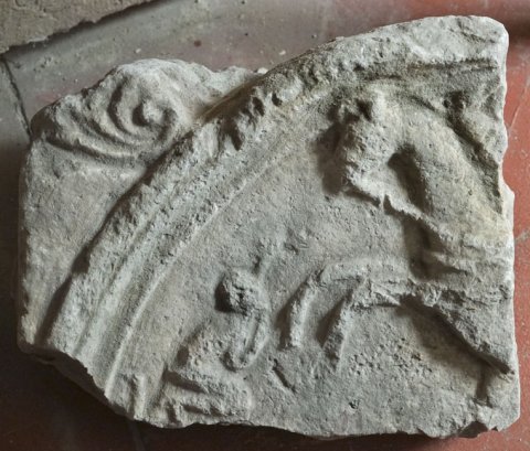 - Gerahmtes Bogenfeld mit Palmettenakroter. Im Feld Reitersoldat nach links, vor dem Pferd knieender Mann (besiegter Barbar ?).