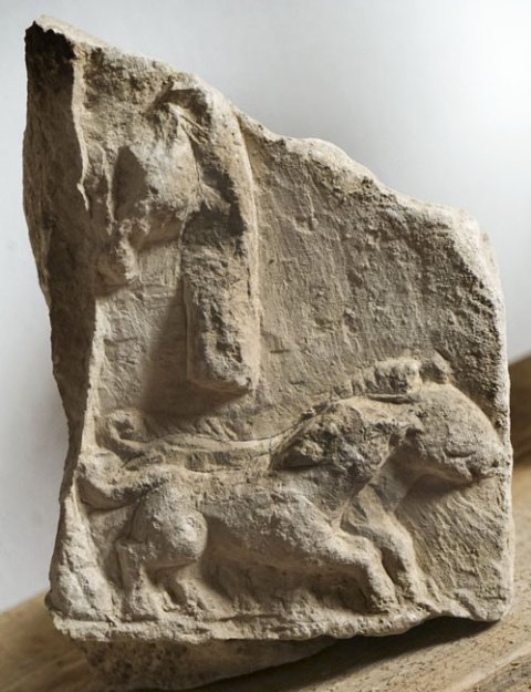 - Zwei kleine nebeneinander laufende Tiere, hinter ihnen Rest eines Tierbeins mit Huf (Umriss einer stehenden Pan-Silvanus-Figur ?).