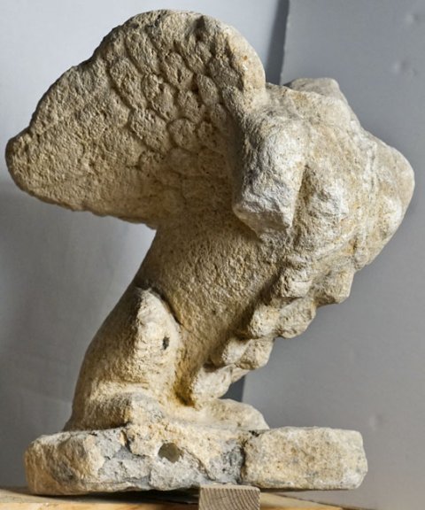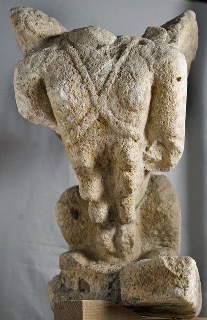 aus Fragmenten zusammengesetzt, Kopf, Unterarme, vorderer Teil der Basis mit Teil der Hinterbeine abgebr.