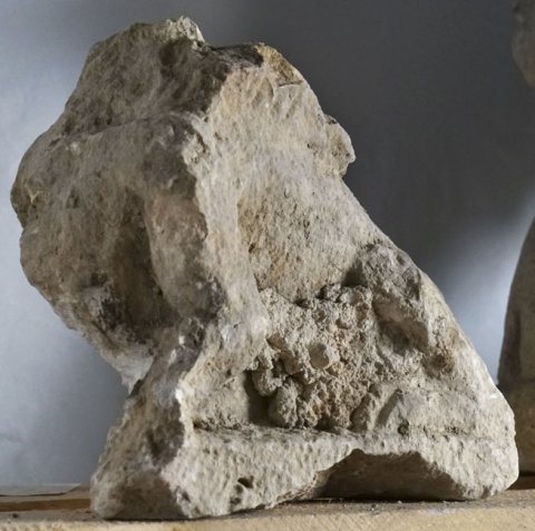 - stark verwittert u. versintert, Kopf, Flügel u. Teile der Arme abgebr.