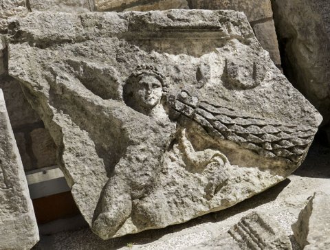 - Schrankenplatte vom Forum (?) mit Blattgirlanden, die von geflügelten Jünglingen (Erot ? Genius ?) getragen werden.